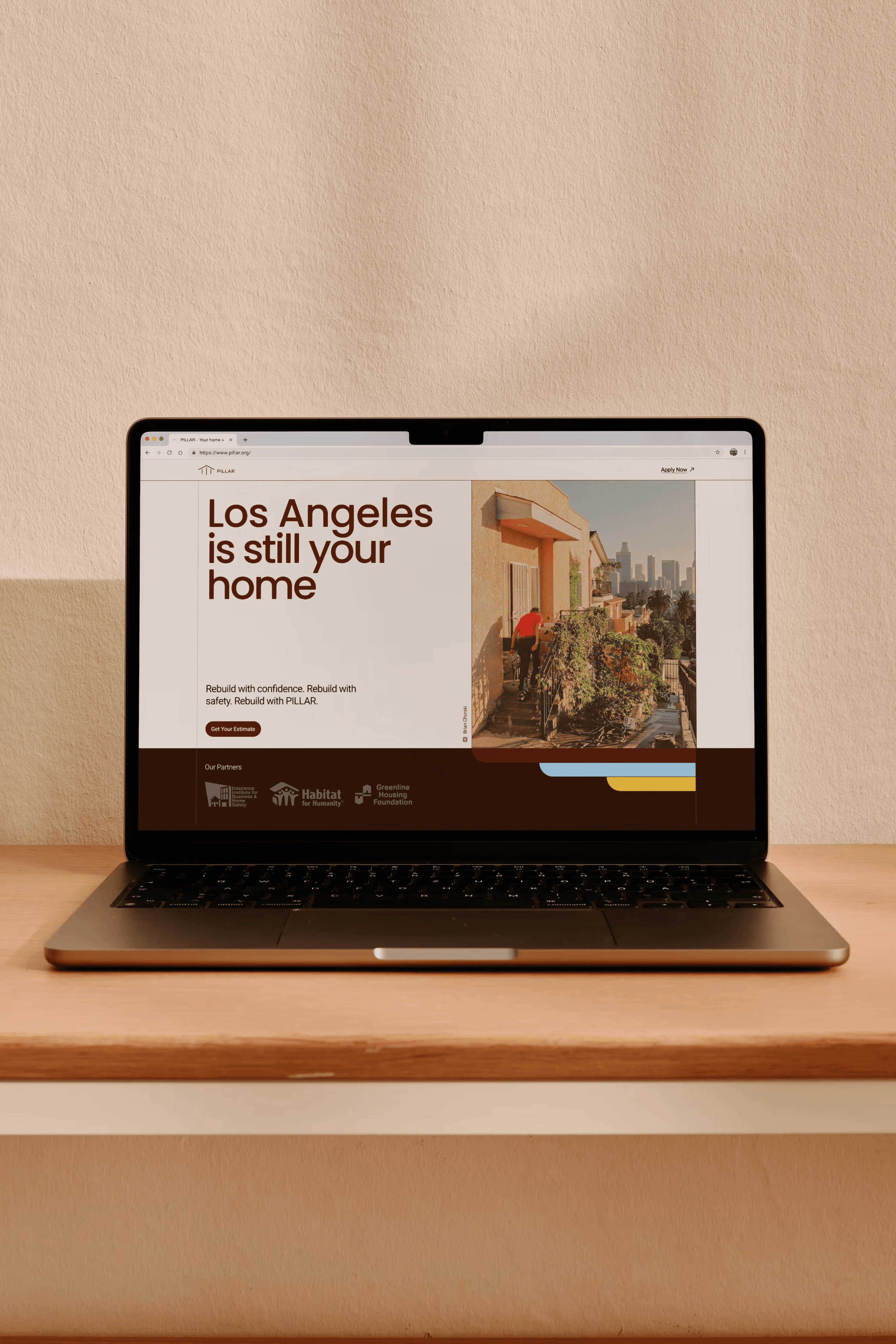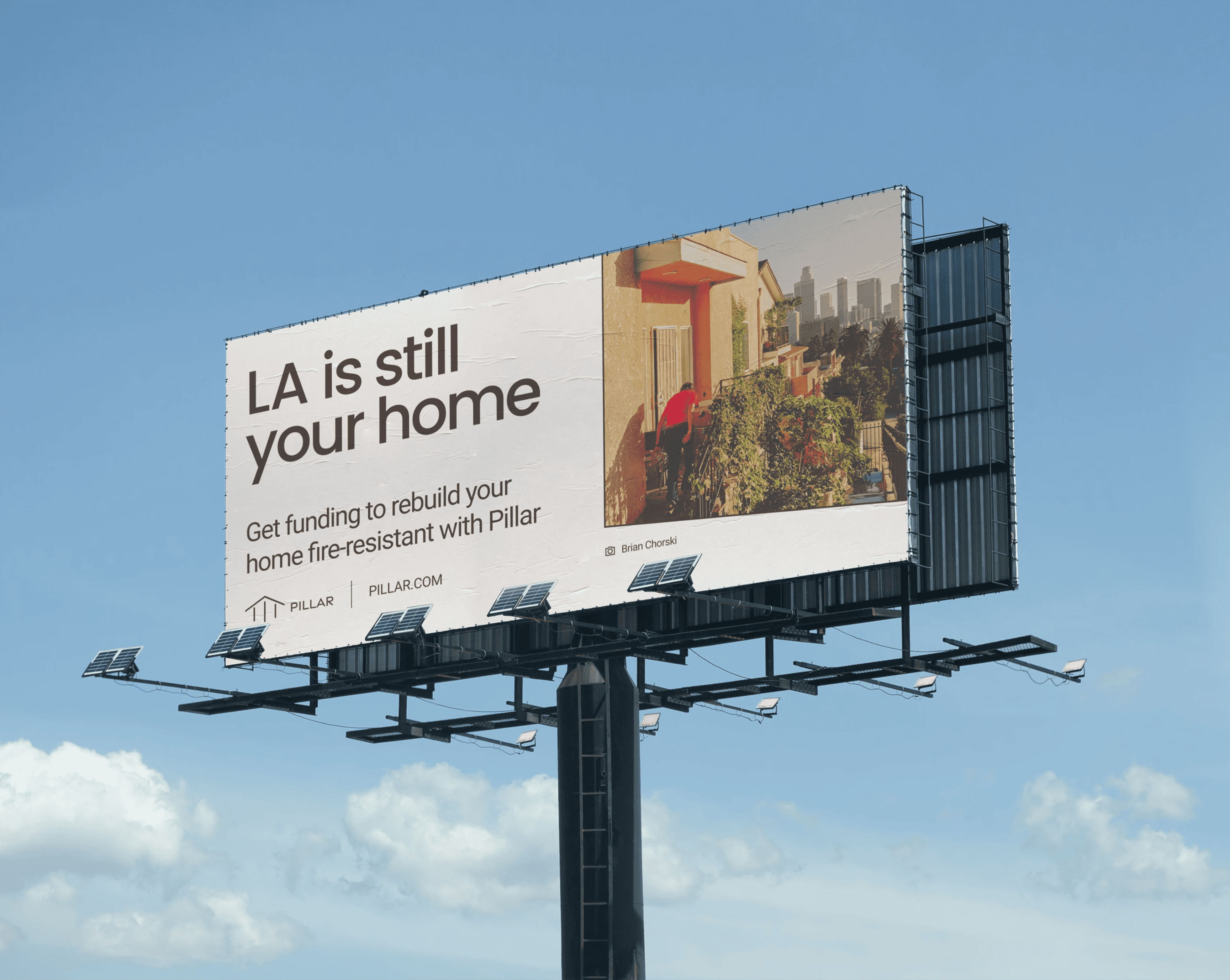 Visual branding for Pillar, a sub-product of The Resiliency Company, helping LA homeowners impacted by the 2025 fires get funding to rebuild their homes fire-resilient. Photo concepts from Brian Chorski, Cobe Tekstra, and others.